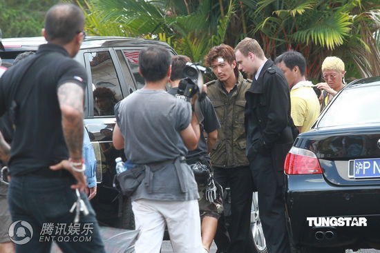 至九时许,霆锋现身当地郊区某福建会馆为电影进行拍摄工作,同场还有周杰伦,其中一幕戏拍摄二人在钢架上攀来攀兼去有说有笑,以背心上阵的霆锋,露出身上纹身。不用走位时二人各也有五、六个保镖护身,当地天气非常炎热,大家也弄得身水身汗。