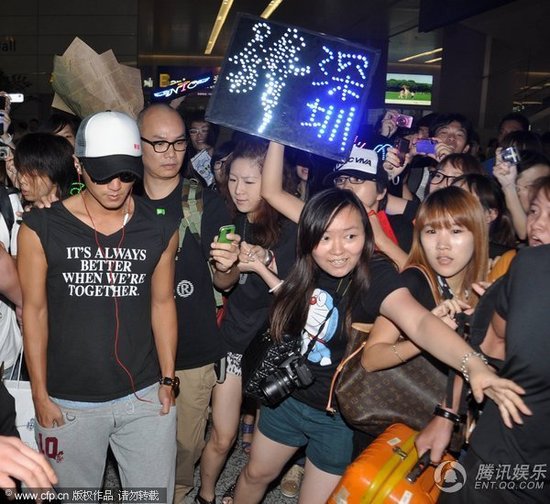 虽然和他同一航班的还有蔡依林、潘玮柏等明星,但机场只有谢霆锋的粉丝守候。粉丝们看到偶像出现后尖叫不已,戴耳机的谢霆锋却充耳不闻,任凭粉丝如何喊叫都毫无反应地低头行走。由于粉丝数量众多,场面一度混乱,谢霆锋及工作人员在去往停车场的路上竟然走错路,短短的路程却走了十几分钟才找到。据悉,张柏芝已于昨日返港全力照顾儿子及处理Lucas开学事宜。